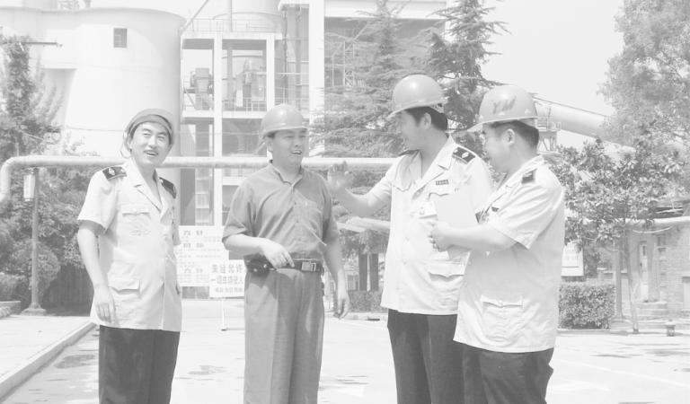 2005 年7 月,山东省邹城市国家税务局峄山分局税务干部到兖矿集团水泥厂开展税源调查,了解水泥生产情况,通过测算该企业的水泥理论产量和销售收入,比对其纳税申报情况,排查涉税风险,研判税收增减变化趋势。图中左一为许东升