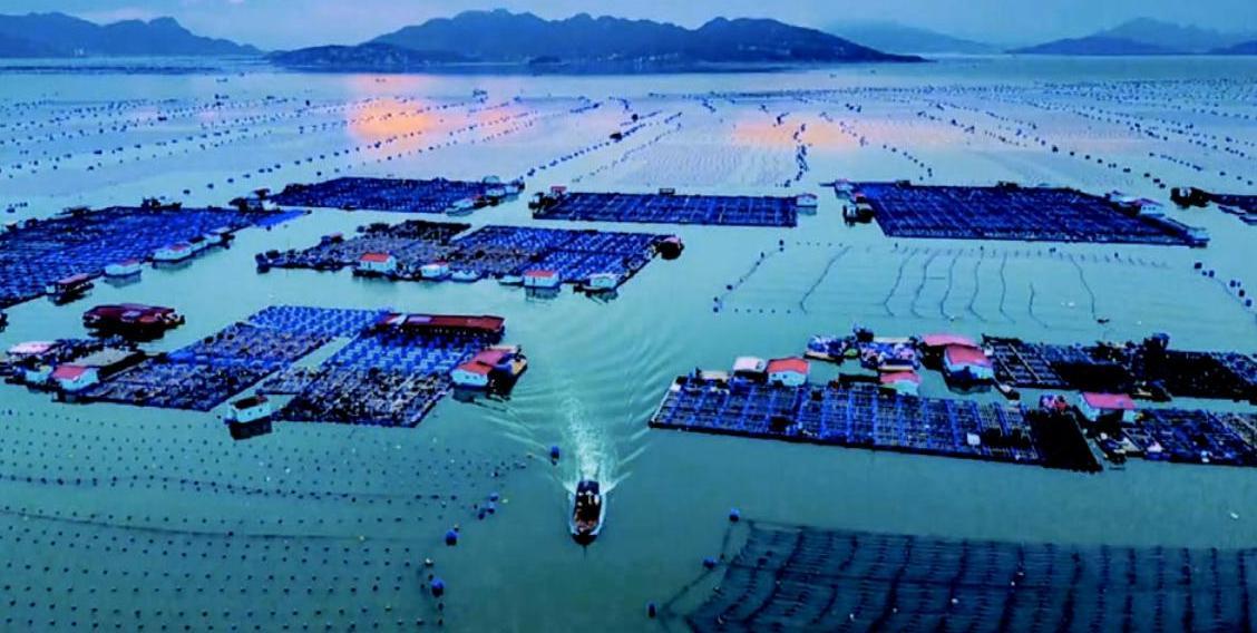 三都澳位于福建省宁德市东南面,距离宁德市区约30 公里,是闽东沿海的“出入门户”。仲夏的三都澳,一块块四方形的“海洋牧场”阡陌相连,在广阔的海面上蔚为壮观。新型塑胶网箱渔排上,数百万尾大黄鱼苗身影雀跃,翻腾出一片金灿灿的景象。
