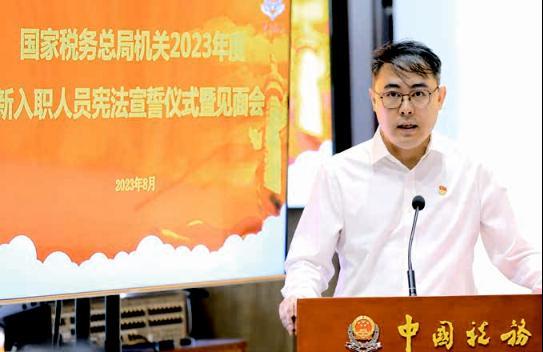 2023 年8 月28 日,国家税务总局举行2023 年度机关新入职人员宪法宣誓仪式并召开新入职人员座谈会。宣誓仪式上,领誓人左手抚按《中华人民共和国宪法》,领诵誓词,全体新入职人员右手举拳,面向国旗跟诵誓词,铮铮誓言,铿锵有力。在随后的座谈会上,机关青年干部代表和新入职人员代表作了发言。他们在发言中表示,将铭记誓言、践行承诺,以昂扬向上的精神状态、时不我待的责任担当,在高质量推进中国式现代化税务实践新征程上贡献青春力量。现将机关青年干部代表智行的发言分享给大家,供学习借鉴。