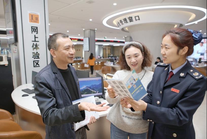 2024 年12 月2 日,国家税务总局宜春市袁州区税务局工作人员发放宣传手册,介绍数电发票相关内容和实操要点 罗玮 邹忠 摄
