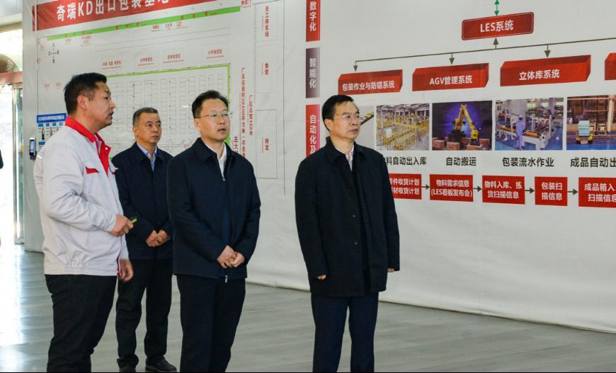国家税务总局河南省税务局党委书记、局长孙群(左三)在开封市综合保税区奇瑞汽车散装件出口包装基地调研出口退税政策落实情况 郝东亮 摄