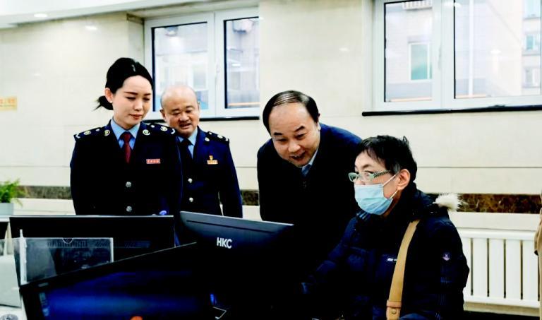 国家税务总局大连市税务局党委书记、局长闻传国(右二)到基层办税服务厅调研税费申报全过程管理,倾听纳税人意见建议