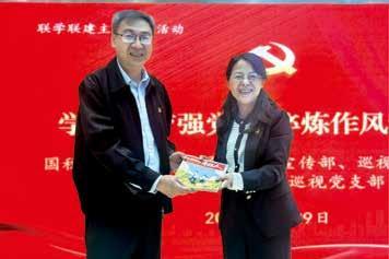4 月29 日,税务总局党建工作局党支部与新华社巡视办党支部开展联学。图为赠送《中国税务年轻人》。