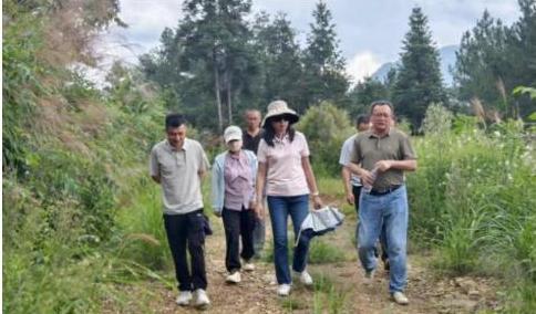 驻村第一书记、工作队队长颜新建(右一)与湖南茶科所专家实地论证莓茶种植条件