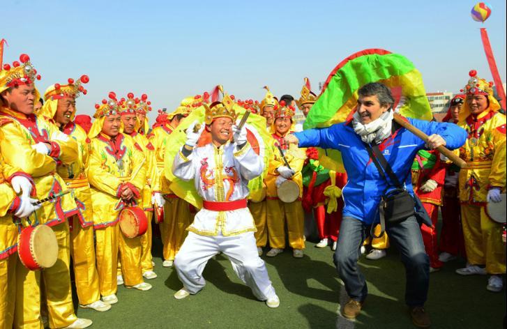 外国游客向鼓子秧歌表演队学习秧歌动作