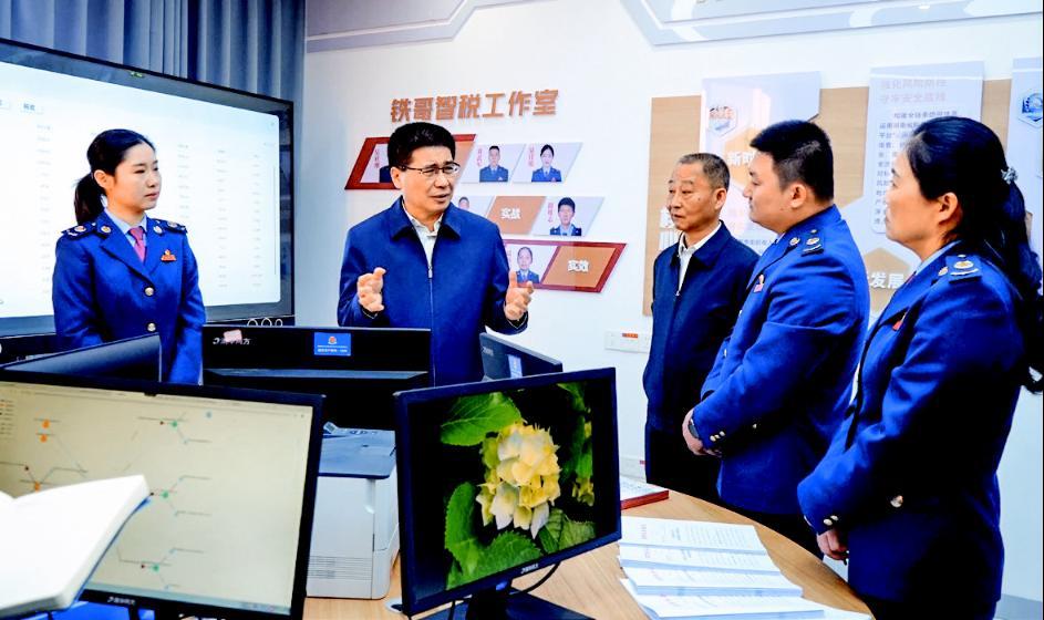 国家税务总局湖南省税务局党委书记、局长曾光辉(左二)在娄底经济技术开发区税务局了解铁哥智税工作室培育发展情况