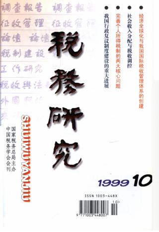 1999年 第10期 论坛 经济全球化与我国国际税收管理体系的创建 张志勇 王晓悦 税制优化中的不确定性 邓力平 詹凌蔚 社会收入分配与税收调控 吴云飞 税收对居民消费的影响 张伦俊 刘新利 强化税收职能与优化税收管理 郄禄秋 李长江 赵劲松 利用税收刺激内需增长的对策研究 钱晟 来稿摘登 堵塞一般纳税人非法扩大运费抵扣的对策 李日胜 张海平 对个体私营经济税收征管的几点建议 赵福增 唐锐 对运输发票抵扣增值税的几点认识 王伟 史丽贤 迟龙堂 税制建设 从基本国情出发改革完善个人所得税 王文鼎 岳村民 完善个人所得税制的两大核心问题* 杨斌 调查报告 加强个体私营经济税收征管的调查 钟小华 征收管理 电子商务发展对现行税制的影响 陈卫东 互联网上的征税系统建设 庞磊 增值税定式稽查方法初探 吴俊红 局长专栏 市场经济体制下的税收政治 杨殿国 浅谈优化税收环境 胡春武 工作研究 增值税会计核算存在的问题及其规范完善 郭平 加强农村地方税税源控管的探讨 王厚俊 万元坤 严峻 税收与法制 我国行政复议制度建设的重大进展 刘剑文 张红 《行政复议法》对税务行政复议制度的影响 皮本固