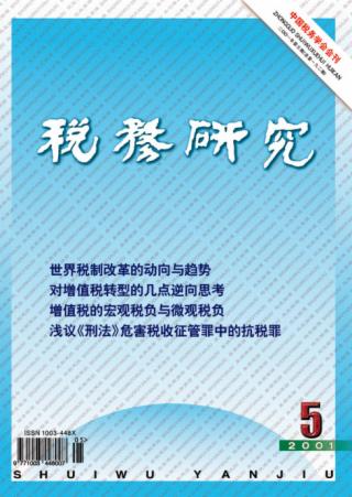 2001年 第5期 论坛 世界税制改革的动向与趋势 邓子基 发达国家20世纪80年代以来税制改革综述 冯守东 人力资源国际流动的税收政策 郑榕 论税收的可持续发展 文英 张林 网络贸易对国际税收制度的挑战及对策 刘华 程海峰 萧艳汾 杨丽华 税制建设 对增值税转型的几点逆向思考 陈晓 方保荣 铁路运输业实行增值税的可行性研究 汪恭彬 张戎 丁忠民 增值税的宏观税负与微观税负 苏筱华 我国当前开征遗产税的适宜性分析 王学农 遗产税和赠与税的征税依据及其功能 王在清 税收征管 税收征管中的若干问题 李大明 计算机在税收管理中的应用原则、定位与突破点 郑以成 进一步加强税收户籍管理 朱晓波 纳税评估若干问题思考 崔源潮 建立增值税一般纳税人纳税信誉等级制度的设想 王建平 工作研究 充分有效地发挥财政税收在西部大开发中的职能作用 刘溶沧 西部大开发与税收政策研究 国家税务总局税收科学研究所课题组 完善我国税收计划管理的思考 李永恒 我国期货市场增值税的处理方法 陈志楣 “间接出口”货物适用税收政策的探讨 江武峰 税收与法制 浅议《刑法》危害税收征管罪中的抗税罪 彭爽 何小王