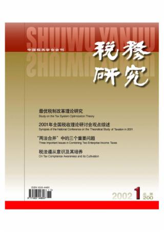 2002年 第1期 论坛 中国税务学会工作报告(*) 王平武 为繁荣我国的税收理论研究再立新功 ——贺《税务研究》出刊200期 何振一 最优税制改革理论研究 中国社会科学院财贸经济研究所 阎坤 王进杰 20世纪80年代以来西方最优税收实证理论发展述评 黄春蕾 西方发达国家多级政府间税收权限与税收范围划分的比较分析 齐志宏 本刊专稿 2001年全国税收理论研讨会观点综述 赵景华 岳树民 税制建设 “两法合并”中的三个重要问题 张学清 潘贤掌 王爱华 关于完善我国现行企业所得税制的构想 江苏省南京市国家税务局税务学会课题组 所得税政策协同研究 吴利群 沈玉平 税收信息化建设 论税收征管专业化与信息化改革 钱国玉 加强税务信息化建设的若干思考 万德利 隋焕新 王磊 运用科技手段和管理新理念深化税收征管改革 赵新平 江武峰 局长专栏 税法遵从意识及其培养 孙利军 增强“四种意识”促进地方经济实现跨越式发展 周广仁 关于新《税收征管法》的几点思考 刘军 综合 2002年税收调研课题 来稿摘登 改进建筑陶瓷业税收征管方式 任晓 实行“分类收入税”的建议 韩荣 调查报告 从地方税收入看深圳市的国企改革 吴直雄 余恩杰 工作研究 关于环境税收几个问题的探讨 付伯颖 齐海鹏 实现“三个转变”完善税务稽查管理 张炜