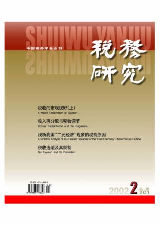 2002年 第2期 本刊专稿 税收的宏观视野*(上) ——关于当前若干重大税收问题的分析 高培勇 论坛 收入再分配与税收调节 马国强 王椿元 税制结构与收入调节 刘广仲 对我国个人所得税现状的分析 董树奎 税收调节个人收入分配的现状 刘丽坚 我国收入分配差距过大的原因及税收对策 安徽省地方税务局课题组 陶成群 郑成良 郭强 倪三立 傅二林 税制建设 浅析我国“二元经济”现象的税制原因 张涛 张波 经济全球化与我国的企业所得税改革 四川省成都市国家税务局课题组 李江波 丁建华 陈明钊 吴岚 刘建 构建规范化和相对独立的地方税体系 隋晓 基础理论 税收逃避及其规制(*) 张守文 税收征管 关于强化税收属地管理的研究 陕西省国家税务局课题组 唐来尚 陆寿成 刘炜 高景侠 王祖文 杨小红 从组织管理学角度分析税务管理的组织结构 平晓峰 税收管理者行为的经济学分析及优化管理机制的策略 李爱红 席酉民 建立税收风险管理体系提高税收管理水平 程明红 我国现行税收征管模式优化的若干问题 潘刚 黄润良 来稿摘登 应加强对税法中税基时间确定基础的研究 刘叔申 税务人员职务犯罪原因剖析及防治 胡锐 税制改革以来我国依法治税工作取得突破性进展 徐宏光 调查报告 关于税务机关服务地方经济发展的调查 苍万琦 李岩 李佩新 工作研究 调整我国税收优惠政策的取向 袁宝玉 促进高新技术产业化的税收优惠政策的原则 宋风轩 边卫红 有效利用外资的税收对策 赵书博 胡江云 借鉴发达国家经验完善我国科技税收政策 张京萍 税史研究 历史上分税制的产生和形成 付志宇