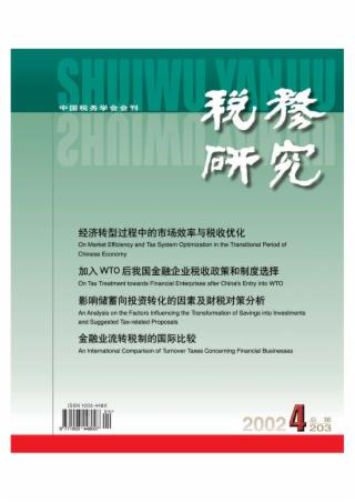 2002年 第4期 论坛 经济转型过程中的市场效率与税收优化 段启华 税收公平的四种体现与重塑我国税收公平机制 林晓 实施结构性税收政策调整增强税制宏观调控能力 范立新 税制建设 加入WTO后我国金融企业税收政策和制度选择(*) 倪红日 影响储蓄向投资转化的因素及财税对策分析 刘华 程海峰 萧艳汾 李丽 借鉴美国经验构建我国金融资产税收体系 肖鹏 创业板的风险控制及税收制度 徐燕 浅析期权视角下股权问题 朱桂芳 董瑞华 关于红股征收个人所得税的探析 何涛 崔轶 本刊专稿 OECD关于电子商务常设机构确定规则研究的最新进展 杨斌 调查报告 从福建省看经济结构调整对税收的影响 ——兼谈促进经济结构优化的税收激励机制 福建省国家税务局课题组 李林木 何荔春 李晖 李林木 陈荣 何荔春 魏润水 王明茂 张金水 王明茂 张金水 李晖 李林木 陈荣 何荔春 魏润水 税收信息化建设 要重视税收信息化建设中的组织管理工作 张德昌 建立全国税收情报信息系统的若干问题 罗成 来稿摘登 出口退税操作实施的国际借鉴 张宝婷 对个体私营经济的税收管理必须注入新的管理理念 郝建弟 税收征管 税收专业化管理的新探索 王发旺 张立球 陈镜华 我国海产养殖业农业特产税征管问题研究 张勇 工作研究 我国非营利性机构税收优惠政策初探 靳东升 张磊 加入WTO与涉外所得税的优惠 乐秀琪 关于建设税务文化的若干思考 徐刚 夏宁 税收活动中的寻租问题 黄董良 税收与法制 税收法治的内涵与目标 张斌 樊丽明 关于偷税犯罪的若干问题 厉瑞强 税务机关如何有效行使代位权 孟凡中 外国税收及借鉴 西方国家税源管理的经验及借鉴 安体富 秦泮义 国际税收竞争环境下的世界所得税制改革 郑雯 税收国际比较 金融业流转税制的国际比较 杜莉