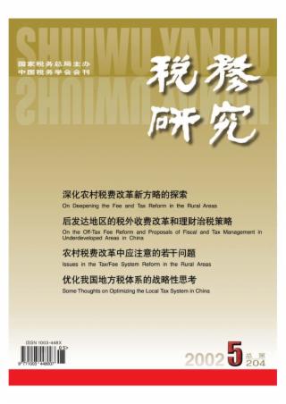 2002年 第5期 论坛 深化农村税费改革新方略的探索 何振一 后发达地区的税外收费改革和理财治税策略(*) 杨斌 邱慈孙 构建适合我国农村地区的税费制度和财政管理制度(*) 郑以成 重新审视农民负担的成因 韩纪江 陈盛伟 改革农业税制与支持农业产业化发展的对策研究 谭珩 本刊专稿 以“三个代表”重要思想为指导积极稳妥地推进农村税费改革 杨遂周 调查报告 农村税费改革中应注意的若干问题 ——对湖北省京山县农村税费改革试点情况的调查分析 湖北省地方税务局课题组 王文童 杨国珍 朱国鑫 艾斌 田涌 袁成 来稿摘登 完善出口退税制度的两点建议 韩灵丽 临时一般纳税人转正应采取定量与定性双重考核办法 樊彩霞 王昆 税制建设 建立和完善我国地方税体系的探讨 高世星 靳东升 优化我国地方税体系的战略性思考 经庭如 许文 借鉴国际经验改革我国地方税制中的流转税体系 徐会希 李志勇 徐正云 西部大开发中的资源税政策 刘植才 税收征管 CTAIS和ISO9000的有机结合是实现“科技加管理”的有效模式 陈捷 优化为纳税人服务的若干问题 姚嘉民 李丽凤 于子胜 从征管理念的更新到征管模式的优化 杨伟文 陈川伟 转变征管理念深化征管改革 陈应斌 税收信息化建设 税收征管信息化建设应当解决的基础性问题 胡道新 工作研究 税收工作要服从服务于经济发展大局 刘景溪 积极推进预算改革是实现依法治税的重要保障 谷晓春 税史研究 费而不病劳而不伤 ——析墨子税役思想的精华 叶青