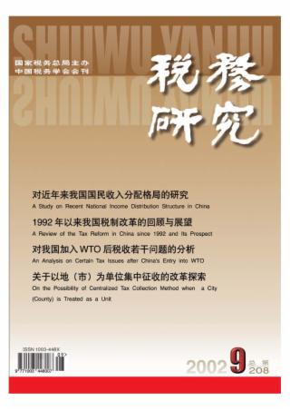 2002年 第9期 论坛 对近年来我国国民收入分配格局的研究 ——兼论税收在国民收入分配过程中的作用 刘扬 税收公平收入分配的局限性分析 王春雷 论居民收入分配差距的税收调节 邴志刚 充分发挥税收对收入分配的调节作用 石坚 改善我国的初次分配状况为税收再分配功能的发挥创造条件 应亚珍 税制建设 个人所得税制应强调公平功能 李光龙 个人所得税代扣代缴舞弊行为的博弈分析 王其伟 洪阮球 完善我国个人所得税制的几点建议 乔亚平 赵乐勋 来稿摘登 规范负数增值税专用发票管理的对策 饶立新 郭勋才 完善增值税制的几点建议 姜忠和 梁鸿 本刊专稿 1992年以来我国税制改革的回顾与展望 刘佐 局长专栏 经济全球化下税收调控职能作用的体现与拓展 周苏明 对我国加入WTO后税收若干问题的分析 周广仁 基础理论 国际税收竞争与生产要素的税负分布 陈涛 税收征管 关于以市(地)为单位集中征收的改革探索 钱宝荣 对建立以城市为中心的税收征管改革的思考 曾飞 葛开珍 强化税务稽查职能作用提高税务稽查效能 徐锦辉 税收信息化建设 适应税收信息化的税务纪检监察工作 段光林 深化税收征管改革与税收信息化建设 王冬梅 工作研究 规范我国税收秩序的若干问题 文英 张林 增加地方税收收入保证地方财政需要 刘宝忠 确立以人为本的税收管理思想 安福仁 税收筹划探研 陈庆萍 陈黛斐