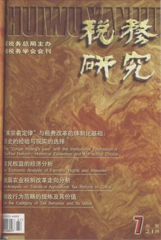 2003年 第7期 本刊特稿 “黄宗羲定律”与税费改革的体制化基础:历史的经验与现实的选择 秦晖 论坛 农民权益的经济分析 杨晓达 我国农村税费改革的参照系及发展趋势 管荣开 走出农村税费改革怪圈要靠制度创新 吴春山 叶青 提高我国产业竞争力的税收政策 崔颖 税制改革 我国农业税制改革走向分析 杨春玲 中国谷物生产受关税下调影响的实证估算 黄建军 刘继萍 按照统筹城乡发展的要求改革我国农业税制 商旭澄 对农村税费改革中税费负担不均问题的探讨 郭希林 论文摘萃 推进农村税费改革工作的几点建议 纪晗 加强个人所得税征收管理要走信息化道路 沈彤 税法理论与实务 税收行为范畴的提炼及其价值 张守文 有关普通发票管理的职务违法行为辨析 —从剖析一典型案例说起 张晓东 税务机构执法主体资格探析 余信照 局长专栏 知识经济时代税务系统人才开发对策 牟可光 税收征管 征管改革中倾向性问题的克服和目标取向 易凯 浅谈农产品收购增值税进项税额抵扣的管理 路奎健 “两法合并”中应考虑的税收优惠和税收征管问题 许建国 外国税收与借鉴 西方各国涉农税制的比较 马国贤 陈东 美国高新技术产业税收优惠政策及对我国的启示 孟庆启 工作探索 关于进料深加工结转业务税收问题的思考 郭吉毅 为纳税人服务:问题与对策 林祥 林国镜 浅议促进我国中小企业发展的税收政策 姜竹