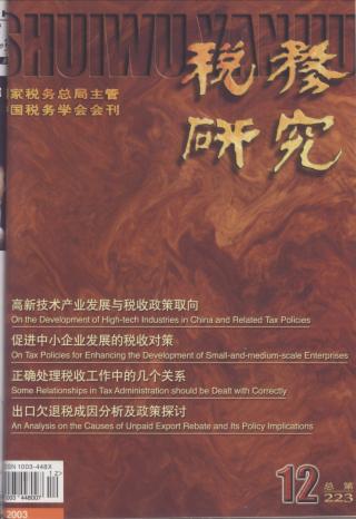 2003年 第12期 论坛 高新技术产业发展与税收政策取向 丛明 促进中小企业发展的税收对策 黄旭明 姚稼强 发展中小企业亟需改革税制 杨卫华 尹淑平 浅谈企业的核心竞争力 刘敏 本刊特稿 正确处理税收工作中的几个关系 尚力强 税制改革 出口欠退税成因分析及政策探讨 隋镇 出口退税政策仍需完善 王学农 对我国出口退税问题的再研究 杨震 对中央与地方分担出口退税的看法 石建华 关于解决出口欠退税问题的两种方案 韩灵丽 局长专栏 试行办税“全程服务”的意义和成效 钱宝荣 实现西部优势转化的税收政策 杨文利 税务管理 税收流失的经济影响与防治对策 曲顺兰 路春城 统计方法在税务稽查选案中的应用 何晓群 王作成 强化个体私营经济税收征管的措施 张柏林 刘桂林 论文摘萃 加强基层税务工作的几点意见 杜德茂 税收征管向纳税服务型的转变 孙成华 试论新时期我国税收的政治功能 朱明辉 实行税收联合监管的机制 于观跃 增值税“即征即退”征管方法初探 方金虎 黄琼 税收法治 关于纳税人权益的思考 王征 税收执法责任制实施中的问题及建议 刘培松 陈奎 朱振 外国税收与借鉴 国外纳税服务的经验及借鉴 曾飞 工作探索 企业对外投资税收筹划中应考虑的因素 李林根 税收敏感性与跨国公司直接投资 牛泽厚 外资税收优惠政策的有效性及再调整 夏霖 以税收作为基本社会保障资金的筹措方式 乔志明 何伟 胡新华 谈爱和