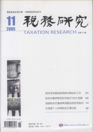 2005年 第11期 本刊特稿 用科学发展观统领新时期税收工作 国家税务总局课题组 论坛 税收优惠政策的经济效应与优化思路 刘蓉 我国税收优惠政策调整的原则和取向 郭宏 论税式支出适度规模和效益 陈庆萍 调整现行主要税种税收优惠制度的设想 刘荣 朱彩婕 陈洪仕 对再就业税收优惠政策的分析与修正 王建刚 韩毅 李中健 科技型中小企业税收优惠问题研究 国家税务总局税收科学研究所课题组 “两税合并”之际涉外税收优惠应何去何从 韩霖 对涉外企业所得税优惠政策结构性调整的建议 韩海金 观点摘要 观点摘要4则 税制改革 论我国个人所得税的主要目标 杨卫华 个人所得税改革:提高费用扣除标准首当其冲 崔光营 个人所得税与收入再分配(*) 张文春 改革个人所得税免征额之我见 潘明星 调整税率更能减轻工薪阶层的税负 向东 岳树民 论文摘萃 计税工资标准亟待取消 李莉 优化纳税服务 提高税收征管质量和效率 许建国 税收执法责任制推行中应重视的问题 刘进 调查研究 吉林省税收与经济相关度较低的原因与对策 于颖哲 振兴东北的区域性财税政策选择(*) 高艳荣 朱洪革 车辆购置税征管情况的调查分析 罗亮生 赵峰 徐先锋 国际税收 国际避税的危害及我国反避税 陈捷 国际税收竞争对我国的启示 孙群 孙讷 外国税收与借鉴 中、日、韩等国注册税务师制度分析与比较 苏强 借鉴他国经验 开征我国的教育税 席卫群 税收征管 我国公民的纳税意识 刘锋 涉外税务审计的现状问题及改进建议 叶建芳 尤家荣 宋夏云 税收管理员制度的发展走向 胥德明 周伯良 蒋剑超 工作探索 电子商务环境下税收法律体制的构建 金香爱 非营利组织企业所得税存在的问题及改革方向 李雪松 完善上市公司关联交易税务规制的思考 周建龙 构建社会主义和谐社会的税收思考 李晶 税史研究 中央苏区的税收规模 曾飞