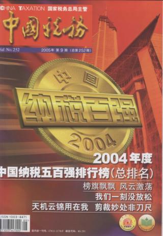 2005年 第9期 插页 税务身边的税控服务专家 杭州腾龙管业有限公司 中国税务论坛 比贡献,促诚信,做好纳税百强排行榜 本刊特约评论员 舒启明 纳税百强 2004年度中国纳税五百强排行榜(总排名) 2004年度中国外商及港澳台商投资企业纳税百强排行榜 2004年度中国上市公司纳税百强排行榜 2004年度中国私营企业纳税百强排行榜 2004年度代扣代缴个人所得税企业百强排行榜 2004年度中国七十行业纳税二十强排行榜 2004年度中国纳税百强排行榜说明 国家税务总局计划统计司 榜旗飘飘 风云激荡 ——2004年度中国纳税百强排行榜分析 本刊记者 王平 简讯 税控收款机:走向全面推广应用 本刊记者 孙一冰 专家视点 个人所得税法的改革方向 俞光远 特别策划 税收事业发展 思想工作护航 本刊记者 刘威威 我们一刻没放松——十二位税务局长谈思想政治工作 王素平 刘威威 王平 高宏丽 李莉 陈双专 本刊专稿 天机云锦用在我 剪裁妙处非九尺 ——安徽省国税系统机制创新侧记 高宏丽 柯俊 李小林 众志成城 突破跨越 ——安徽省国税系统机制创新漫议 本刊评论员 任平