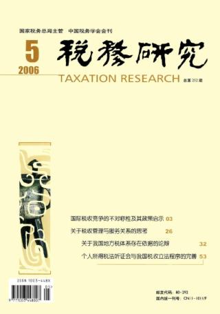 2006年 第5期 论坛 国际税收竞争的不对称性及其政策启示 邓力平 国际税收竞争的福利效应分析 黄焱 国际税收竞争的动态分析及我国的对策 李友平 黄燕 常永涛 对我国现行税制运行质量的评析(附图片) 郝春虹 从拉弗曲线形态变化看税收与国民经济的关系(附图片) 柯艺高 完善地区间税收分配制度 推进经济增长方式的转变 张海燕 荆新 本刊特稿 关于税收管理与服务关系的思考 李林军 税制改革 关于我国地方税体系存在依据的论辩 杨斌 工业增值税与相关经济总量关系宏观分析方法初探(附图片) 胡彦伟 李笑兰 增值税转型对上市公司影响的实证研究(*)(附图片) 杨震 刘丽敏 完善我国环境税收制度的探讨 周宝湘 试论开征社会保障税的税制基础 高亚军 税法理论与实务 个人所得税法听证会与我国税收立法程序的完善 施正文 论税收法治 韩灵丽 避税的法律规制 钱俊文 论文摘萃 企业所得税征管审计中应注意的问题 门韶娟 改革现行房地产税制的几点看法 安仲文 钟芳青 刘镇 局长视点 科学发展观与我国税收法治建设 汪康 税务违法举报案件管理中存在的问题及建议 杨德华 调查研究 从江西经济社会发展状况谈中部崛起的税收政策 周广仁 山西地方级税收收入比重偏低的分析与对策 山西省地方税务局课题组 外国税收与借鉴 美国税务代理的经验及借鉴 董根泰 张为民 工业化国家不同发展阶段的外商直接投资税收政策 窦清红 工作探索 论信息化支撑下的税收业务整合 徐夫田 刘尊涛 我国福利事业税收优惠的绩效分析 万莹 对“免、抵、退”税问题的思考 吴丽梅 股权投资会计与税务处理 王瑶文 丁学满 积极稳妥地推进税制改革 孙本良