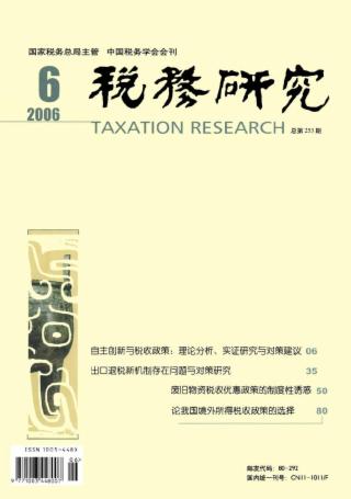 2006年 第6期 税务学会秘书长工作的特点及方法(*)杨崇春 税务学会秘书长工作的特点及方法(*) 杨崇春 论坛 自主创新与税收政策:理论分析、实证研究与对策建议(*)(附图片) 夏杰长 尚铁力 构建税收激励机制 提升企业自主创新能力和动力 岳树民 孟庆涌 促进企业核心技术创新的财税政策选择(*)(附图片) 王根贤 支持创新税收政策的制度基础和路径选择 郭宏 增强我国自主创新能力的税收政策探讨 范宝学 我国税制对国民经济增长影响效应的实证研究(附图片) 许生 促进我国中小企业发展的税收政策研究 黄旭明 姚稼强 税制改革 出口退税新机制存在问题与对策研究 马维胜 出口退税率与汇率变动关系(附图片) 饶爱民 王晓洁 出口退税新机制对广西的影响及政策建议(附图片) 广西壮族自治区国家税务局课题组 出口征税及现行免抵税额计算中存在的问题(附图片) 解宏 调查研究 废旧物资税收优惠政策的制度性诱惑 王祺元 税法理论与实务 税收法治:规范我国税收竞争的利器 蒋荣富 毛杰 税务行政复议制度若干问题刍议 冯丽 影响纳税人守法因素之分析 熊英 论法律信用与我国税收信用体系建设 黄桦 案例分析 税款追缴引发的对税收代位权的思考 杜永明 林耀 对多种手段共同造成少缴税款的定性处理 鲍崇军 税收征管 从发达国家税收征管经验看我国税收征管机制的改革 周虹 谢波峰 谷昱璇 从“消极避税”到“阳光筹划”(附图片) 黄凤羽 浅议税收征管风险 贺焱 浅析税收管理员制度 杨萍 张万江 外国税收与借鉴 论我国境外所得税收政策的选择 应亚珍 欧盟直接税协调的比较分析与借鉴 陈琍 工作探索 整体资产置换涉税事项计税依据的界定及会计核算(附图片) 吴坚真 对于恢复酒类专卖的探讨 吴才麟 霍华枝 电子纳税服务平台建设中存在的问题和对策 林昶 影响税收软环境的因素分析 康建军 侯伟 论文摘萃 提高审计质量的几点建议 杨兆地 提高当前税收行政执法水平对策研究 孙悦