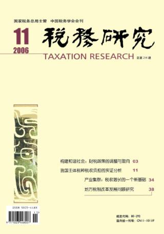 2006年 第11期 论坛 构建和谐社会:财税政策的调整与取向 刘尚希 构建和谐社会过程中的税收责任 唐慧斌 我国主体税种税收负担的实证分析 孙玉栋 对我国税制结构的分析及建议 吴京芳 影响产业结构优化的税收因素与政策措施 黎昌卫 政府负债风险与税收的相关性 邢俊英 我国税收内在稳定性研究(附图片) 郭凯 论文摘萃 对征管查联动机制的探索 齐立富 邴康 创新管理理念 创新管理机制 何兵 企业所得税征管中存在的问题及对策 徐勤玲 蒋铭 加强房产税征管的浅见 史卫甫 严郓 郑寿松 蒋蓉 浅谈税务机关与纳税人之间的关系 姜伟波 本刊特稿 产业集群:税收增长的一个新基础 刘纯彬 税制改革 地方税制改革发展问题研究 李万甫 韩庆玲 地方税若干问题思考 广西壮族自治区地方税务局课题组 我国地方税制存在的问题及完善措施 程雪松 论公共财政架构下的地方税制 冯曦明 税法理论与实务 增强企业国际竞争力应成为我国税法的价值取向 沈玉平 王国海 葛夕良 注册税务师行业法律规制研究 张晓平 左进明 论税法的需求 王军 税收撤销权之依据及适用 贾砾 调查研究 成都市房地产经济税收发展趋势分析(附图片) 石恩祥 汤兰 从税收数据透析西藏经济发展 格桑次仁 企业所得税改革对贵州省经济发展的影响及对策 黄静 孙春雷 郑榆 税收征管 个人生产经营收入所得税税率设置中的问题(附图片) 张天胜 时间价值对双元控制主体企业所得税逃税决策的影响(附图片) 刘华 刘锦源 鄢圣鹏 税收管理中的寻租行为 郭永利 加强工艺品行业税收管理的探讨 金丽琴 外国税收与借鉴 美国财产税的征收办法对我国物业税的借鉴 方建国 梁瑞明