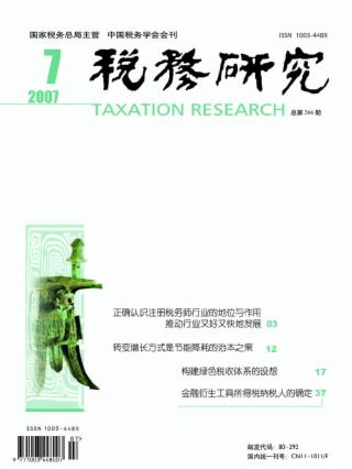 2007年 第7期 本刊特稿 正确认识注册税务师行业的地位与作用推动行业又好又快地发展 董树奎 论坛 节能潜力知多少? 邓英淘 转变增长方式是节能降耗的治本之策 陈庆修 构建绿色税收体系的设想 丁芸 从制度成本角度看污染税的开征 李兰 税收与水资源保护关系的研究 罗会武 利用外资的税收政策分析及转型建议 《利用外资的税收政策分析及转型建议》课题组 税收优惠政策对FDI质量影响的实证分析 傅元海 税制改革 金融衍生工具所得税纳税人的确定(*) 雷根强 刘建红 我国金融衍生产品市场税收政策研究 向凯 我国金融衍生产品税收制度探讨 郭田勇 赵昌川 对我国股票期权税收制度的思考 侯翠平 张建华 浅谈我国开放式基金的投资风格 欧阳敬东 名家访谈 资源环境产权制度缺陷对收入分配的影响与治理 ——访著名产权经济研究学者常修泽 本刊记者 王敏 税收征管 依托信息技术提高税源管理效能 梁阜 陈晓 郭凤晓 对ERP企业实施有效税源监控的途径 奚振航 完善我国税源监控管理体系初探 付占奎 周波 引入风险管理理念 有效防范税收流失 曾长根 谢永清 税法理论与实务 论偷税罪立法完善 施锐利 我国涉税犯罪刑事立法的法源与演进 张秋华 丛中笑 外国税收与借鉴 环境税的国际比较及借鉴 王哲林 环境税“双重红利”研究综述(*) 刘红梅 孙梦醒 王宏利 王克强 工作探索 落实税收优惠政策的实践与思考 罗涛 王保兰 营业税征税范围问题探讨 王崴 更正启事 税法清算所得与会计清算损益的差异与协调 吴丽梅 利用社会力量加速税务信息化发展 李静敏