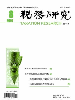 2007年 第8期 论坛 推进新农村建设的政策走向 韩俊 涉农财税政策选择的制度分析(*) 杨志勇 加快广东省新农村建设财税金融政策的思考 杨来发 从广州市服务业税收视角看我国服务业发展 广州市地方税务局课题组 我国服务业与税收的互动关系(*) 夏杰长 李小热 充分发挥税收在促进服务业发展中的作用 沈彤 本刊特稿 论我国经济社会发展深层次问题的财税体制根源 朱诗柱 韩青 税制改革 局部地区增值税转型将造成西部大开发政策优势边缘化 赵恒 增值税转型:从优惠政策到公平税负 王建平 增值税转型对山西煤炭企业及税收收入的影响 吴素贤 兰太萱 董其文 中部崛起与增值税转型 陈懿赟 张立球 中部地区增值税转型问题研究 戴海先 江时益 局长视点 全面推进税务教育培训工作的思考 许月刚 税收征管 商业零售环节增值税管理存在的问题 刘锋 加强基层增值税精细化管理 覃先文 论文摘萃 浅议税收非正常户的管理对策 马伟 加强地方税税源管理的对策 梁仲通 税法理论与实务 技术标准化的税收制度研究(*) 韩灵丽 试析税务代理人的法律责任 陈晴 工作探索 现行税收会计核算改革的基本思路 李志远 推行分级分类稽查的可行性及其建议 杨德华 扩大就业的税收政策取向 刘明 外国税收与借鉴 美国税制和税收征管的特点及启示 李方旺 美国企业重组并购的免税政策探析 解宏 胡泾捷 东盟国家税收征管体制改革的经验与借鉴 吴崇伯 国际税收 中英转让定价税制比较 宋本强 学术动态 邓子基教授税收研究述要 ——写在庆祝邓予基教授从事教育60周年之际 雷根强 张兴祥