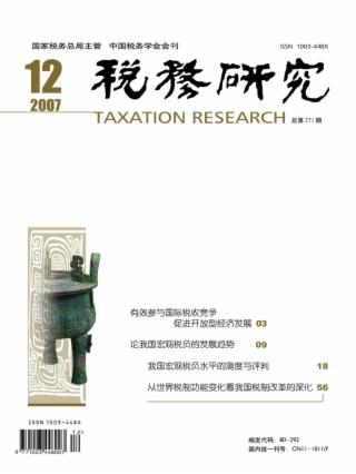 2007年 第12期 本刊特稿 有效参与国际税收竞争 促进开放型经济发展 邓力平 论坛 论我国宏观税负的发展趋势 刘新利 我国宏观税负水平的测度与评判(*) 李波 我国宏观税负和税收弹性的动态分析 张德志 我国当前的宏观税负水平评析 钟鸣明 宏观税负结构分析及优化建议 河南省税务学会课题组 2006年地区税收收入的差异分析(*) 张伦俊 申山宏 区域税负再认识 匡小平 肖建华 四川省税收收入与GDP关系的实证分析及其VAR预测模型 李洁 影响湖北省宏观税负水平的关键因素 湖北省地方税务局课题组 税制改革 从世界税制功能变化看我国税制改革的深化 王守昆 我国现阶段财产税的整合与优化设计 杨志安 我国财产税制存在的问题及改革思路 彭立峰 高翔 税法理论与实务 税法价值取向约束下的个人所得税税率设计(*) 沈玉平 吴霖 对“偷税手段”的立法分析 袁森庚 税收征管 税收精细化管理水平测度的理论探讨 郭驰 向景 框架效应影响税收遵从的实验研究 王韬 许评 工作探索 对改进和优化纳税服务有关问题的探讨 王国华 荣海楼 从执法者的素质视角探析税收执法风险规避 谢双进 税务文化建设的实现途径 黄玉远 观点摘要 观点摘要五则 论文摘萃 国有企业改制中的五个税收管理问题 刘克勇 刘晓光 学术动态 中青年税收理论工作者研讨会观点综述 2007年中青年税收理论工作者研讨会在湖北召开 水颜 2007年总目录 税务研究2007年总目录