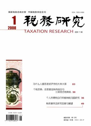 2008年 第1期 本刊特稿 为什么人服务是经济学的大本大源 夏小林 论坛 运用税收政策 稳房价促和谐 杨卫华 第三次分配与我国和谐社会的构建 白彦锋 基于税收累进性的公共支出福利效果评析(附表格) 陈卫东 税收公平内涵的解析与税收制度审视 秦蕾 支持穷人收入增长的税收政策探析(*) 张克中 彭涛 王伟域 税制公平与公平收入分配 赵丽萍 税制改革 个税改革:还是要加快向综合与分类结合制转轨 高培勇 推进个人所得税自行纳税申报制度有效运行的探讨 岳树民 个人所得税自行申报纳税问题研究*(附表格) 吴利群 董根泰 个人所得税自行申报纳税的现实与选择(*) 赵书博 个人所得税公平功能的实证分析(附表格) 刘小川 汪冲 我国个人所得税分类税制转向综合税制评析(附表格) 张明 税法理论与实务 税收基本法研究回顾与展望 汤贡亮 刘爽 论税法解释的目标 陈少英 曹晓如 在新《企业所得税法》下构建小企业税收制度研究(附表格) 郑琳 关于新《企业所得税法》受控外国公司规制的探讨 周金荣 纳税人生存与发展权的法律保护 王建平 局长视点 关于加强和改进依法行政工作的思考 周广仁 坚持科学发展 构建和谐税收 ——第八届全国友好城市地税局长会议发言摘要 税收征管 信息不对称在税收征管中的效应研究 李文 纳税人遵从度“二元”特征形成的税负差异及其治理 欧斌 纳税评估、日常检查、税务稽查关系 许建国 税收征管质量和效率的模糊综合评价探析(附表格) 谢滨 工作探索 运用税收杠杆助力企业“走出去” 马克和 陈启英 侯伟 知识型干部管理:税务人力资源开发的新课题①(附表格) 韩青 公允价值变动损益税务问题探讨 朱莲美 论文摘萃 税收管理员主观能力与客观要求矛盾的分析与解决 梁平 徐晨