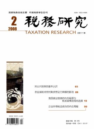2008年 第2期 本刊特稿 对公共财政的基本认识 贾康 论坛 农业减税对农村剩余劳动力转移的影响*(附表格) 杨宜勇 我国就业困境的内在根源与税收政策的导向选择(附表格) 李林木 税收和就业的经济学分析 董再平 税收优惠促进就业的效应探析(*) 方重 梅玉华 税制改革 《企业所得税法实施条例》:凸现新税制的国际化和规范化(附表格) 王海勇 慕野 新《企业所得税法》对外商直接投资规模的影响(附表格) 苑新丽 王春雷 朱晓波 论新《企业所得税法》下对外投资涉税政策的优化 韩仁月 常世旺 中国企业所得税法与WTO规则从冲突走向协调*(附表格) 罗秦 试析新《企业所得税法》对交通运输设备制造业的影响 李晓旭 新《企业所得税法实施条例》与新会计准则的协调与差异 叶建芳 周兰 基于新《企业会计准则》下的股票期权所得税问题研究 贺宏 税法理论与实务 企业所得税法统合的内在局限(*) 张守文 特别纳税调整规则法理基础之探究 徐孟洲 叶姗 企业所得税优惠过滥的法律思考 涂龙力 涂京骞 新《企业所得税法》中的非居民企业投资所得与国际税收协定的协调 徐妍 调查研究 新《企业所得税法》对成都市企业所得税负担水平的影响预测(附表格) 刘蓉 黄洪 国际税收 我国反避税立法进程的回顾与思考 聂杰英 税收征管 完善我国税收管理体制的初步构想 王德平 构建和谐征纳关系的利益基础与税制路径 蔡军 崔浩 税收管理员行为控制与激励优化路径分析 李文平 工作探索 银行业务结构与流转税税负关系的实证分析(附表格) 陈宝熙 林玢 增值税税负转嫁的代数模型研究(附表格) 萧艳汾 浅议税收风险及其预警机制(附表格) 田凤平 任征 邓谷祥 丁宝辉 外国税收与借鉴 股票期权激励税收处理的国际比较与政策启示 王哲兵 韩立岩 国外税收征管的最新趋势 丁一 论文摘萃 新《企业所得税法》对外商直接投资的影响 李嘉明 宛成钢