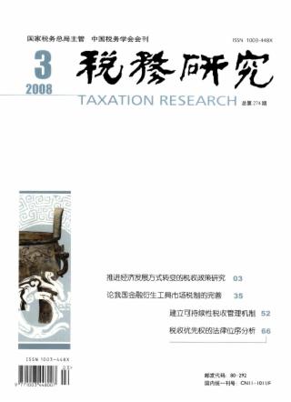 2008年 第3期 论坛 推进经济发展方式转变的税收政策研究(附表格) 倪红日 促进循环经济发展的税收制度设计(附表格) 邓子基 韩瑜 可再生能源产业的相关税收问题探讨 高树兰 我国应对全球气候变暖的税制绿化分析 魏陆 关于碳税问题的研究(*) 李伟 张希良 周剑 何建坤 我国煤炭生产与消费的环境税收问题 韩存 侯运炳 试论我国绿色税收体系的构建 毛夏鸾 张晓阳 朱淑珍 汽车消费领域促进节能减排的税收对策 孔晏 税制改革 金融衍生工具的税收问题探析 赵锡军 顾苏秦 论我国金融衍生工具市场税制的完善 冯源 韦瑞伦 税收在资本市场中的功能定位及政策取向(附表格) 曲顺兰 路春城 资本利得税与我国证券市场的发展(*) 阮永平 解宏 促进“农民工”群体就业的税收政策 马列 石红梅 对促进就业税收优惠政策的效应分析 姚林香 车文军 局长视点 建立可持续性税收管理机制 赵恒 推行税收征管规范化管理的思考 许月刚 论文摘萃 化解税务稽查执法风险的相关建议 谢锋 张惠玫 王雨 “长尾定律”在税收管理上的应用 钱宝珍 李博 新《企业所得税法》的实施对内资企业财务状况的影响 宋效中 姜铭 分期收款销售的会计处理对增值税的影响 郭芃 税法理论与实务 税收法律行为的私法学分析 李刚 税法的私法化及其限度 陈治 税收优先权的法律位序分析 赵建国 国内税收竞争的法治视角探析 冯绍伍 税收立法权纵向划分的经济法理念 周俊鹏 调查研究 对纳税人行为的实证研究*(附表格) ——基于对江苏省自然纳税人个人所得税缴纳状况的调查 田利华 杨抚生 税收征管 试析税收征管机制的改革与创新 贾敬全 浅析税收战略管理及其思维模式 王国清 陈宗贵 征税成本问题探讨与实证检验 王奉炜 工作探索 关于企业所得税会计相关问题的探讨 陈均平 新《企业所得税法》对外商投资的近期效应分析(*) 赵迎春 分期收款销售纳税调整的演变和思考 王一舒 朱学义 增值税会计处理方法之我见 韩东京 观点摘要 观点摘要三则