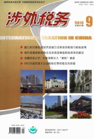 2010年 第9期 卷首语 导读 财税观察 建立和完善促进经济发展方式转变的税制与税收政策 丛明 战略性行业:市场调节? ——从铁矿砂长期协议价谈起 梁晓 图片新闻 图片新闻 赵薇薇 图片新闻 米相来 刘泽华 《涉外税务》编委会2010年度工作会议在京召开 赵薇薇 “国际税收研讨会”在昆明市召开 高阳 研究与探索 现代型增值税的特点及对我国增值税制改革的建议(*) 韩绍初 现代型增值税与我国增值税制改革 苏筱华 借鉴国际经验推进我国增值税立法(*) 涂京骞 涂龙力 国际服务贸易的增值税税收管辖权及其应用研究 国家税务总局税收科学研究所课题组 货物和劳务一体化课征增值税的原理及我国的改革需求 杨默如 李平 金融服务业增值税的三种课征模式及对我国的启发 任小燕 促进产业集群技术创新的税收政策探讨 任春红 国际税事评说 金融危机之后全球或将步入“增税”通道 韩霖 各国税收纵横 OECD成员国大企业税收征管经验及其借鉴(*) 深圳市国家税务局课题组 大企业税收管理的国际经验及启示 杨杨 杜剑 德国公司并购税制:变迁、内容及特点 苏毓敏 赵岩 欢迎订阅:《中国税务》《税务研究》《涉外税务》 法规选登 财政部、国家税务总局联合发布《关于企业境外所得税收抵免有关问题的通知》 案例点评 对某公司境外股权转让案例的评析 徐建华 赵琳威 欢迎投稿 层层分析识巨亏 汤军 汤建 袁萍 税收实务 关于企业所得税框架下总分机构汇总纳税的思考 孙隆英 对房地产企业所得税征管的探索 安徽省芜湖市地方税务局课题组 税收征管新思路:第三方信息利用 李汉文 莫尔学 税收与生活 加拿大税务一瞥(*)