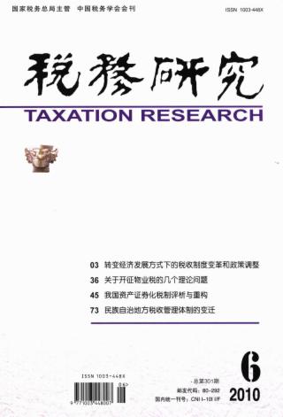 2010年 第6期 论坛 转变经济发展方式下的税收制度变革和政策调整 丛树海 促进制造转型升级的税收政策思考 钱宝荣 促进低碳经济发展的财政政策(*) 张德勇 有利于启动内需的税收制度 李心源 加快推进有利于扩大内需的税收制度改革 许生 税负差异对地区资本流入的影响 林颖 税收政策变动影响我国国有企业固定资产投资的实证研究(*) 李成 王哲林 税收与民间投资的计量分析 吴旭东 刘宝如 本刊特稿 关于开征物业税的几个理论问题(*) 安体富 金亮 税制改革 我国资产证券化税制评析与重构(*) 尹音频 辜红帆 我国证券制的改革与完善 闻媛 股票期权支出的税前扣除问题(*) 张伦伦 潘雷驰 完善我国创业投资基金的税收政策 刘仁和 余志威 私募股权投资税收政策探讨(*) 张学勇 完善我国教育投入税收政策的建议(*) 任强 《税务研究》撰稿须知 论文摘萃 完善纳税评估工作的几点建议 钟国柱 提高基层征管水平的思考 牛明奇 税法理论与实务 从税法层面完善自查补税处理办法 刘卫红 税收管辖制度初探 邢树东 关于构建我国税收赦免制度的思考 孙虹 谭军 税收征管 民族自治地方税收管理体制的变迁 霍军 从税收征纳交易费用看税收征管制度改革 王乔 龚志坚 纳税人需求分析 朱庆民 王吉武 案例分析 超标准但未申办增值税一般纳税人的销售额确定 鲍崇军 外国税收与借鉴 意大利逃税刑事法律责任的立法及其对我国的借鉴(*) 施正文 翁武耀 从国外二元所得税制的经验看我国个人所得税课税模式选择(*) 卢艺 工作探索 促进中小企业发展的税收政策选择 汤志水 会计计量属性与计税基础差异的协调 杨黎明 观点摘要 观点摘要四则