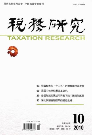 2010年 第10期 本刊特稿 和谐税收与“十二五”时期我国税收发展 邓力平 论坛 我国中长期税制改革研究(*) 安毅 各国财政政策运用背景下的中国税制改革(*) 杨志勇 对我国中长期税收体系建设的思考(*) 汪昊 试析我国税收政策目标与税制改革方向 潘雷驰 陈爱明 税制改革 深化我国税制改革的路径选择 程瑜 “十二五”时期我国税制改革原则思辨(*) 李思 “十二五”期间货物和劳务税制改革研究 魏陆 新时期税制改革面临的形式要求 张天犁 《税务研究》撰稿须知 效率和公平相互协调的税收制度改革探析(*) 刘普照 税法理论与实务 论纳税抵押及其对税收债权效力的扩张 魏俊 刍议纳税人权利之实现 王正明 王冰 对《税务稽查工作规程》的评析 曹福来 陈孟媛 完善税务管理第三方法律制度体系研究 李建国 滕一良 调查研究 出口退税政策对江苏外贸机构优化的影响 冯一江 葛菲菲 赵彦琳 林鹏 关于强化白酒行业税源管理的思考 彭诚 税收征管 推进税源管理专业化的前提与基本模式 马克和 侯伟 汪俊秀 汽车4S店税收管理的问题与对策 王铁勇 李东舒 王耀彬 张光 秦雪 工作探索 我国开征社会保障税应注意的几个基本问题 钟国柱 浅谈契税在房地产市场调控中的作用 张鑫 王婧 试论专业化培训的创新内容及相关关系处理 朱诗柱 关于提高税收数据利用度的思考(*) 武辉 关于税收数据信息分析与应用的几点建议 郑东霞 税务信息化的新特点与应对思路 陈宪东 杨杰 观点摘要 个人所得税费用扣除标准的探讨 胡晓晖 秦刚 外国税收与借鉴 借鉴四方发达国家经验完善我国融资租赁业税收政策 严卫中 唐枫 张华军 论文摘萃 让税务文化成为税务事业发展的新动力 彭正国 完善大企业税收管理与服务机制要注重下好“三着棋” 何立炯 杨鲁均 保障税源分类管理高效运行的措施 张洪 顾强 张俊列