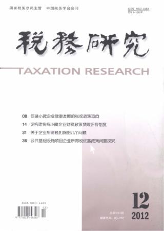 2012年 第12期 税务研究 税务研究 论坛 基于生命周期理论的小微企业税收政策研究 王玺 王蔚 促进小微企业健康发展的税收政策取向 周广仁 论构建扶持小微企业财税政策绩效评价制度(*) 黄洁莉 完善我国小微企业所得税优惠政策的建议 刘金玲 李东波 扶持中小企业发展的税收政策选择 ——以贵州省为例 季可 促进中小企业发展的税收优惠制度改革探讨 吕敏 谢峰 税制改革 关于企业所得税扣除的几个问题 谭珩 公共基础设施项目 企业所得税优惠政策问题探究 ——以网络型基础设施产业为例 冷永生 王朝才 韩津萍 所得税对公司负债资本来源结构的影响初探 陈宝熙 韩化颖 我国房产税改革对微观税负的影响(*) 杨君茹 胡曼军 局长视点 促进我国区域经济协调发展的财税制度设计 张贻奏 发挥货物与劳务税作用以改善民生 孟军 税收征管 试析区域专业化趋势下的税收专业化 刘颖 金一星 试论我国个人所得税 征管模式转变的主线 刘畅 构建纳税遵从个体度量体系的探索 四川省宜宾市国家税务局课题组 税源专业化管理若干问题探析 包逸生 调查研究 纳税服务与纳税人满意度:理论框架与实证分析 袁政慧 赵蓓 陈琳琳 观点摘要 观点摘要三则 工作探索 土地增值税制度与会计准则的差异分析及协调 王玉红 消费者预期、投资需求与房地产税收调控 杨建中 汪树强 刘杰 外国税收与借鉴 欧盟金融业增值税制的主要做法及启示(*) 雷根强 冼彬璋 金融服务业征收增值税的国际比较与借鉴 刘雪雁 借鉴英国增值税“TOGC”规则 完善我国资产重组增值税制度 赵国庆 温彩霞 法国文化产业税收政策对我国的借鉴(*) 杨京钟 洪连埔 论文摘萃 对个人所得税改革的几点建议(*) 吴梦云 陆杰 学术动态 “税制结构优化理论与实践研讨会”在武汉召开 水颜 总目录 《税务研究》2012年1~12期总目录