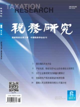 2017年 第6期 本刊特稿 营改增的历史方位 杨克文 李妮娜 财税论坛 产权性质、税收负担与企业财务绩效关系研究(*) □ 蔡 昌 田依灵 关于企业微观税负的衡量问题探讨(*) 庞凤喜 刘 畅 我国区域间税负水平差异空间分布特征及分析(*) 姜 朋 梁俊娇 李羡於 郭文武 我国交通运输业税收负担评价(*) 王冬梅 陈 傲 陈 叶 刘建宾 税负、税收表达权与居民幸福感(*) 鲁元平 杨 芳 税制改革 我国房地产税改革面临的制度抉择 胡怡建 杨海燕 房地产税开征的制度构建(*) 崔志坤 张 燕 个人住房房产税:沪渝效果剖析与未来制度完善(*) 黄 洪 何光其 廖明刚 严红梅 美国房产税的税收限制政策及制度变迁分析(*) □ 李 明 研究探索 国际金融中心建设的税收政策比较研究(*) 白 玉 樊丽明 税费政策调整的宏观经济效应(*) 许文立 郭柃沂 许 坤 环境税“双重红利”在我国的适用性探讨(*) □ 俞 杰 破产程序中的税收债权保护 颜 延 解应贵 基于税收中性理论的 增值税改革研究 赵 锦 我国税收优惠政策对民营企业公益性捐赠的激励效用初探 杜兰英 王 硕 余宜珂 案例分析 创新汽车销售模式引发的巨额补税争议案评析 刘天永 最高人民法院提审的 德发公司案分析 袁森庚 财税法治 税款追征对象的理论探讨与现实选择(*) 杜 爽 孙 静 涉税信息共享中的信息利益冲突与平衡(*) □ 王 霞 刘 珊 环球税收 中国税收透明度建设面临的挑战与对策(*) □ 黄素华 梁若莲 沙特税制及其改革方向研究 吴雁 国地税联合稽查存在问题与改革 王建华 陈玉琢 对赌协议的企业所得税处理 □ 毛谢恩 崔 国 企业注销的税务管理问题初探 □ 尹 泽 黄 刃
