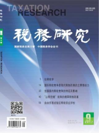 2017年 第9期 本刊特稿 论税收学 杨元伟 财税论坛 国际税收竞争是现代税制改革的主要推动力 龚辉文 我国国内税收竞争的特征及影响 杨卫华 隐性税收竞争及其税收透明度意涵 陈隆近 张军玲 税收竞争与不确定性情形下地方政府征税能力的影响因素(*) 魏福成 税收竞争对区域产业转移的影响研究(*) 关爱萍 胡 期 牛 召 税制改革 烟叶税探析 费茂清 石 坚 环境保护税与其他环境相关税种的协调 赵 弘 环境保护税的征管效 率与激励效应预估(*) □ 崔亚飞 吴 琼 祁 丹 研究探索 自由贸易试验区税收效应评析(*) 王智烜 王 雪 邓力平 契约型证券投资基金税收政策研究 高金平 产能过剩对税收增长的影响(*) 河北省国家税务局收入规划核算处课题组 完善中关村科技创新 税收政策的思考(*) □ 北京市地方税务局 北京税收法制建设研究会课题组 税制绿化问题研究(*) 刘芳雄 李公俭 关于股东利用其特殊地位侵害国家税收利益的应对 杨 亮 我国增值税一般纳税人认定标准设计 田志伟 财税法治 “计税依据明显偏低,又无正当理由”在实践中的应用 朱长胜 环球税收 防范专利盒税制成为跨国企业集团避税的工具(*) 励贺林 付广军 金砖国家研发税收支持政策比较(*) 高凌江 税收管理 从税收管理走向税收治理 □ 郭月梅 厉 晓 基于非正式经济治理的小微企业推定课税(*) 谷 成 孙 璐 浅议营改增后外国企业常驻代表机 构的税收管理 孙隆英 试论我国小微企业税务风险内控体系的构建(*) 程 黎 陈 盈