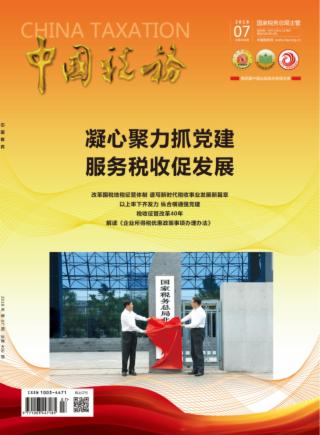 2018年 第7期 中国税务时评 书写历史拥抱未来 上下同欲推进改革 本刊特约评论员 时政纵览 大事 观点 数字 税务要闻 致敬光荣历史 拥抱美好未来 国家税务总局指导各地推动国税地税征管体制改革向纵深迈进 本刊特稿 改革国税地税征管体制 谱写新时代税收事业发展新篇章 黄诗睿 特别策划 凝心聚力抓党建 服务税收促发展 以上率下齐发力 纵合横通强党建 国家税务总局机关党委 深化思想认识 加强党性教育 中共国家税务总局党校常务副校长 曾光辉 党建引领税收高质量发展 夏玉辉 韩宗文 于旻 “加减乘除”夯实基层党建 李树荣 龚榆 党建为基 筑税收发展之本 庞革新 欧阳红梅 王博 “一二三四”推动基层党建落地生根 李宏 陈静 李赛男 争创“五星支部” 激发党建活力 王亦琪 税务人生 树基层典型创示范团队 黄晨 静静的“税”月美如歌 朱雷旦 陈徐璐 图片新闻 “七一”前夕 6 月15 日上午 国家税务总局北京市税务局 浙江省龙泉市税务部门 浙江省嵊州市税务部门 江苏省扬中市市税务局 江西省宜春市税务部门 “改革开放40周年看税收发展”征文 税收征管改革40年 周广仁 与增值税改革同行 赵恒 文化长廊 那些难得一见的算盘 江志伟 “賨”古烁今 王江志 孙斌 俞华 政策解读 解读《企业所得税优惠政策事项办理办法》 刘韶华 何冰 《企业所得税税前扣除凭证管理办法》 基本概念解析 何冰 业务指南 长期股权投资后续计量的税会差异 高金平 戎晓健 农产品进项税额 抵扣“三二一法” 叶美萍 陈玉琢 钟税官信箱 钟税官信箱 “互联网+税务” 区块链技术在新时代税收征管领域的应用探析 白玉明 陈卓 人工智能在税务咨询领域的探索和尝试 李侠 魏春寒 车购税APP系统使办税更便捷 孙晓斌 李静 工作探索 离退休干部自我服务与管理工作探索 国家税务总局离退休干部办公室 降低增值税税率消费者受益有多少 刘佐 对无形资产跨境交易税收管理的探讨 王蔚 李加姜 高质量推进纳税服务外包 崔静 税收法治化框架下的稽查工作思考 吴华 黄路娜 探索建立自然人纳税人识别号制度 张玮 提升督查质效 破解落实难题 岂凤春 万钧 薛志成 多措并举提升基层税务部门内部审计质效 张振盛 王存亚