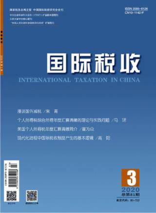2020年 第3期 本刊特稿 漫谈国外减税 朱青 专题策划 个人所得税综合所得年度汇算清缴的理论与实践问题* 马珺 新个人所得税法下居民个人综合所得年度申报浅析 张晓 郑悦 我国开展个人所得税综合所得年度汇算清缴申报预填服务的SWOT分析和建议 尤笑宇 个人所得税汇算清缴风险管理体系构建研究 ——基于税法遵从视角 颜宝铜 第三方信息在个人所得税征管中的应用初探 王葛杨 比较税制 美国个人所得税年度汇算清缴简介 董为众* 新西兰个人所得税年度汇算清缴概述及经验借鉴 肖坚 易奉菊 张娟 从日本、韩国税收实践看我国个人所得税汇算清缴工作 糜懿全 夏宏伟 跨境税收 现代化进程中国际税收制度产生的基本逻辑 高阳 “一带一路”税收 中国“走出去”企业“一带一路”税收调查报告 “一带一路”税收研究课题组 中资企业投资“一带一路”沿线国家(地区)面临的税收挑战及对策建议 ——以深圳跨国企业为例 杨肖锋 邹闻苡 税收实务 特许权使用费税收风险评估及管理分析 刘伟 李俭