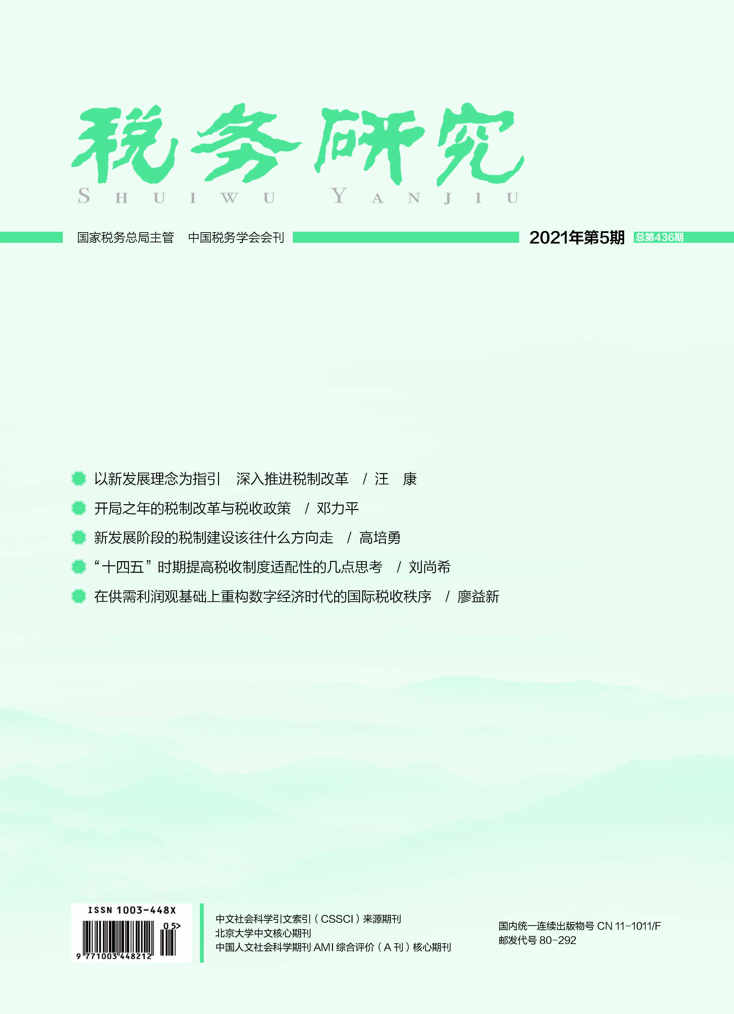 2021年 第5期 新时代 新征程•税收现代化 以新发展理念为指引深入推进税制改革 汪康 开局之年的税制改革与税收政策 邓力平 新发展阶段的税制建设该往什么方向走 高培勇 “十四五”时期提高税收制度适配性的几点思考 刘尚希 本刊特稿 在供需利润观基础上重构数字经济时代的国际税收秩序* 廖益新 税制改革 税收优惠对先进制造业企业创新水平的影响* 李远慧 徐一鸣 税收优惠、财政补贴与企业研发投入* ——基于沪深A股上市公司的实证分析 卫舒羽 肖鹏 企业成长与降杠杆:固定资产加速折旧政策的激励效应 钟国辉 陈高 刘锋 “数字经济与税收治理”征文 数字人民币对税收正义的影响研判及因应对策* ——以涉税信息利用为切入点 胡元聪 曲君宇 运用遗传算法优化税收风险分析指标模型的思考 李为人 王一杰 环球税收 RCEP国家区域性国际税收协调机制研究* 刘书明 余燕 2021年度日本税制改革述评:疫情冲击下的经济复苏与增长 李清如 高阳 税收法治 新《行政处罚法》背景下税务行政处罚的理念嬗变与制度调适* 吕楠楠 税收共同治理法治化中的软法应对 汪虎生 研究探索 城市化进程与税收收入结构* 许晖 税收促进消费的理论逻辑与政策选择* 刘乐峥 陆逸飞 推动西部地区产业结构转型升级的财税对策探讨* 唐世芳 葛琳玲 李顺明 对森林开征资源税的理论依据、现实基础与制度设计* 董玮 秦国伟 税收管理 应用“区块链+银税互动”促进小微企业融资的研究 安然 杨雷鸣 试论税务绩效管理的理论逻辑* 赵子建 财税史鉴 税收助力深圳经济40年发展的实践与经验 黄智文 学术动态 “国家治理与地方税体系建设”研讨会暨第八届“邓子基财税学术论文奖”发布会在武汉举办 齐烨 《税收征管法》修订 为税收治理现代化保驾护航 ——“国家治理与税收征管法修订”征文活动圆满落幕 齐烨