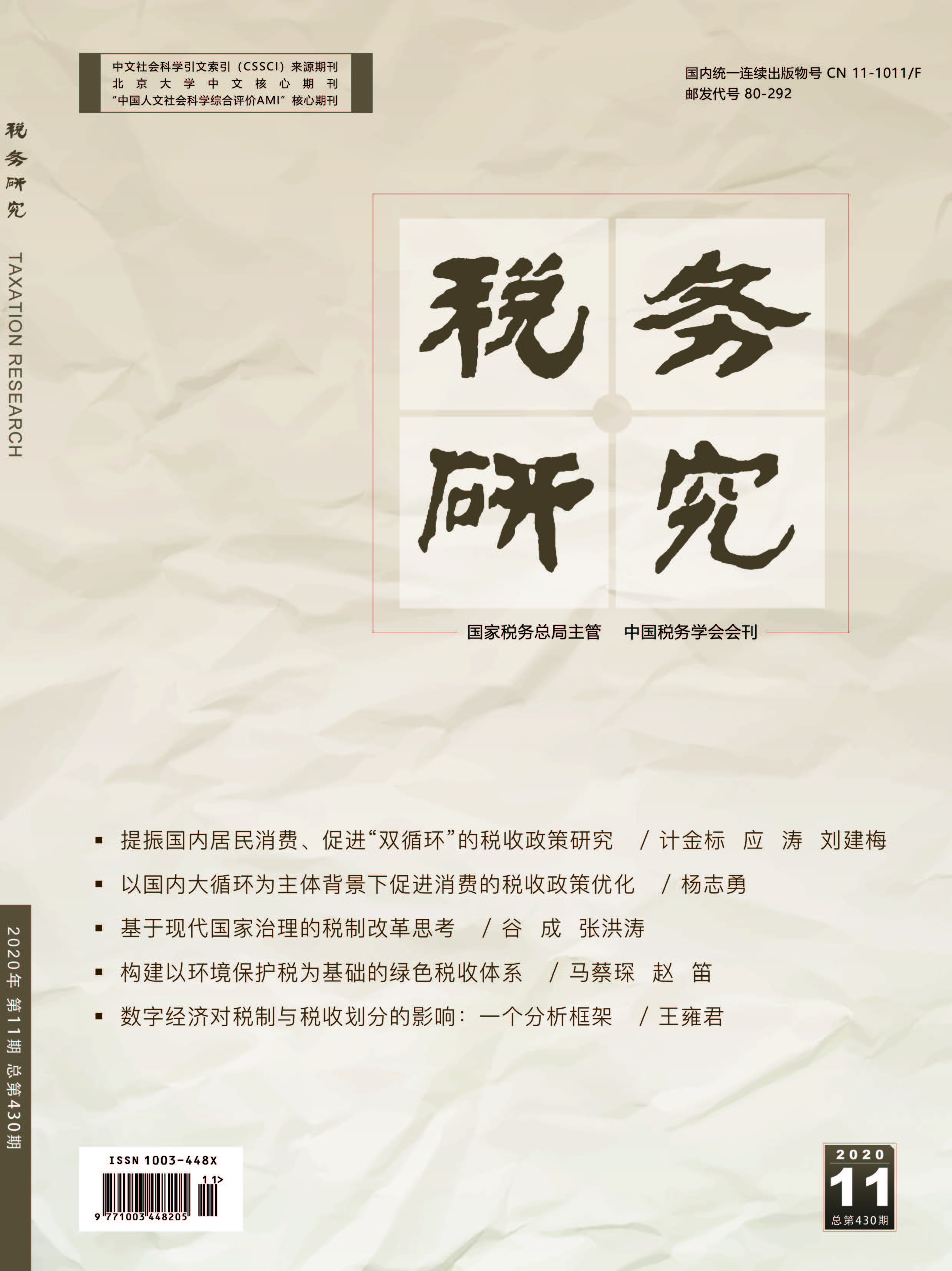 2020年 第11期 新时代税收发展论坛 提振国内居民消费、促进“双循环”的税收政策研究* 计金标 应涛 刘建梅 以国内大循环为主体背景下促进消费的税收政策优化 杨志勇 促进我国居民消费扩大和升级的税收政策研究* 李香菊 付昭煜 基于现代国家治理的税制改革思考* 谷成 张洪涛 税制结构优化与地方政府治理* 储德银 费冒盛 黄暄 税制改革 构建以环境保护税为基础的绿色税收体系* 马蔡琛 赵笛 促进危险废物利用处置的税收政策研究 龙凤 林菲 毕粉粉 连超 税制绿化度对环境污染的影响分析* 包健 环境保护税的主要问题与优化策略研析 黄洪 张世敬 局长视点 扎实推进新时代税务信息化建设的实践与思考 吴紫骊 “数字经济与税收治理”征文 数字经济对税制与税收划分的影响:一个分析框架 ——兼论税收改革的核心命题 王雍君 数字服务税的制度实践及其效应研究* 崔景华 李浩研 “国家治理与税收征管法修订”征文 税收优先权法律冲突检视* 王一鹤 纳税人自查在税务稽查中的运用及完善 ——兼谈《税收征管法》的修改 郑甫华 邓永勤 金理 环球税收 全球最低税改革方案及其影响研究 何杨 杨宇轩 数字经济跨境课税之 “双支柱”方案的创新、影响及应对 郝东杰 陈双专 案列分析 从一起非居民企业间接财产转让案看合理商业目的的判定 周优 陈慧娴 孙丽梅 研究探索 税收政策促进农业农村领域PPP模式发展研究* 唐祥来 康锋莉 税务中介组织对企业税收遵从的影响考察* 张座铭 田彬彬 税收管理 税务系统领导班子和领导干部绩效指标体系的构建* ——基于ahp方法的研究 黄英 强化数据要素驱动推进智慧税务建设的思考 杨磊 推进涉税信息共享的 《税收征管法》修订思考 林溪发 关于运用大数据推进税收治理现代化的思考 王葛杨
