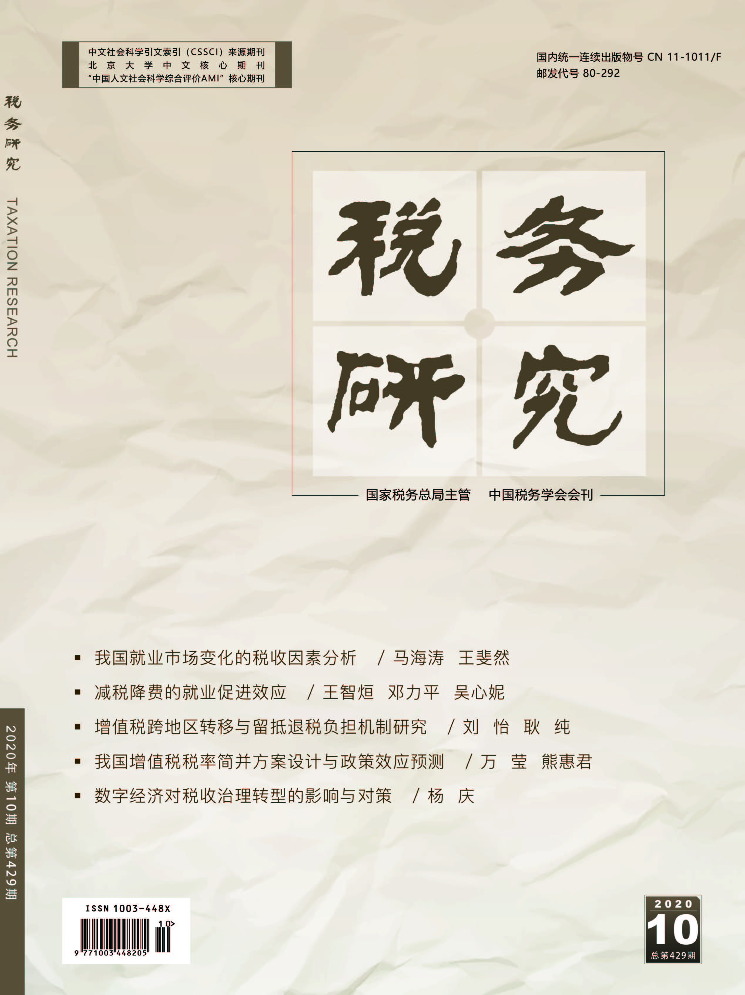 2020年 第10期 新时代税收发展论坛 我国就业市场变化的税收因素分析* ——基于产业结构调整视角 马海涛 王斐然 减税降费的就业促进效应* ——基于异质性企业框架视角 王智烜 邓力平 吴心妮 对中小企业减税可以提高其吸纳就业能力吗* ——基于中小板上市公司数据的分析 冯海波 陆倩倩 当前保就业的财税政策定位与对策* 何代欣 税制改革 增值税跨地区转移与留抵退税负担机制研究* 刘怡 耿纯 我国增值税税率简并方案设计与政策效应预测* ——基于可计算一般均衡模型 万莹 熊惠君 房地产税改革对居民家庭消费和储蓄行为的影响* 刘华 陈力朋 周曼扬 “数字经济与税收治理”征文 数字经济对税收治理转型的影响与对策 ——基于政治经济学和治理理论分析视角 杨庆 数字经济所得课税国际规则制定的最新进展及中国应对* 邱冬梅 “国家治理与税收征管法修订”征文 “互联网+”背景下《税收征管法》修订基本理念研究* 江燕 李鑫钊 符裔 浅议新形势下税收执法与税收司法的衔接 ——以《税收征管法》的修订为视角 涂京骞 案列分析 关于不动产司法拍卖“纳税义务人”认定争议的分析 廖仕梅 研究探索 研发费用加计扣除政策促进了企业降杠杆吗? ——基于医药制造业上市公司双重差分模型的检验 袁业虎 沈立锦 研发费用加计扣除政策对高新技术企业研发投入的影响分析 甘小武 曹国庆 减税降费政策效应:宏观约束和微观主体感受 李水军 税负对我国在东盟国家直接投资的影响研究* 邹忠全 谢廷宇 李琪 税收管理 税收风险管理数字化转型研究* 国家税务总局深圳市税务局课题组 我国税收征管研究的演化路径、热点及展望 ——基于citespace可视化知识图谱分析 赵涛 普小龙 价值、境况与路径:基层税务监管体系建设的多维审视* 赵李叶 学术动态 中国税务学会第八届理事会第二次全体会议暨减税降费与 “六稳”“六保”论坛在北京召开 于嘉音 《税务研究》编委会工作会议在杭州召开 于嘉音 深入研究数字经济,高质量推进税收治理现代化 ——“数字经济与税收治理”学术研讨会在海口成功举办 齐烨