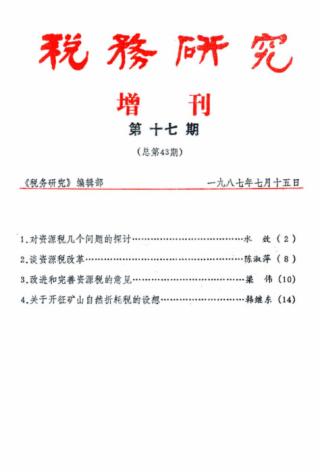 1987年 第17期 对资源税几个问题的探讨水效 对资源税几个问题的探讨 水效 谈资源税改革陈淑萍 谈资源税改革 陈淑萍 改进和完善资源税的意见梁伟 改进和完善资源税的意见 梁伟 关于开征矿山自然折耗税的设想韩继东 关于开征矿山自然折耗税的设想 韩继东